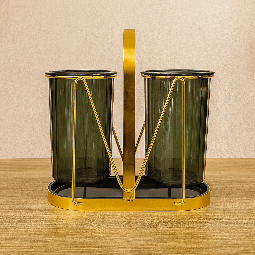 Ajoutez une touche de raffinement à votre cuisine ou salle de bain avec ce set de 2 gobelets effet fumé, accompagnés d’un porte-gobelets en métal doré au design moderne et luxueux. Parfait pour une utilisation quotidienne tout en sublimant votre espace !