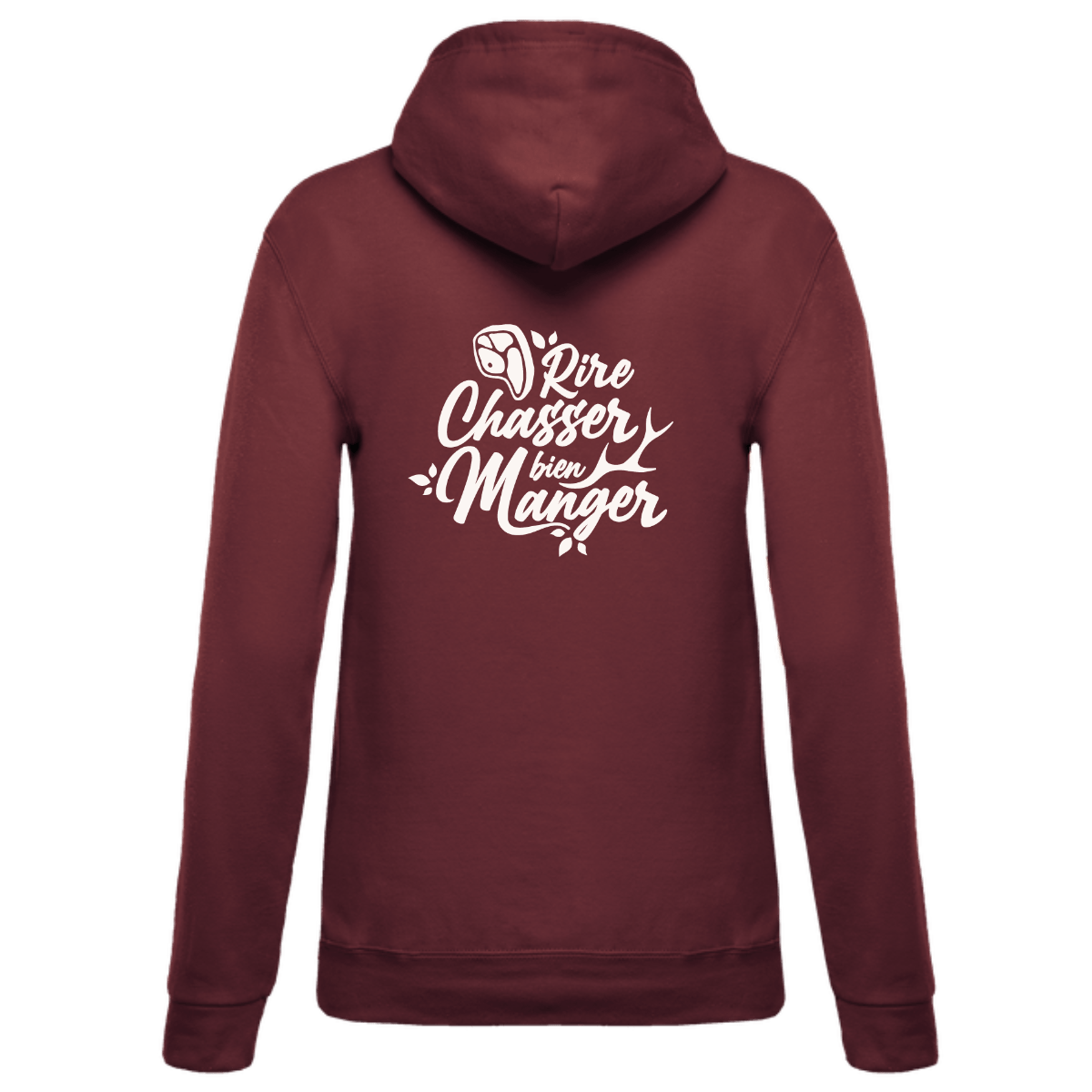 Dans le dos, notre slogan “Rire, chasser, bien manger” s’exprime en Broderie premium, avec justesse et fierté. Un sweat doux, structuré, et affirmé — pour celles qui vivent dehors avec style.